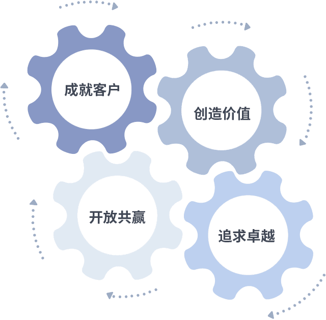 成就客户是一切决策的出发点,,创造价值是衡量所有工作的标准,,,,追求卓越是我们做事做人的态度,,,,开放共赢是我们的格局也是最终的结果。。。。价值观的齿轮环环相扣,,,,推动着组织里的每个人不断向前。。